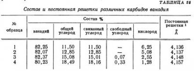 Чтобы избежать образования нитридов, Муассан восстанавливал пятиокись ванадия обугленным сахаром в угольной трубе без доступа воздуха (в дуговой печи). При этом был получен хорошо проплавленный, слегка графитизированный продукт, содержащий 81,3% V и 18,4% С, т. е. близкий по составу к монокарбиду ванадия. Изменяя температурный режим, удавалось получать также ряд обогащенных ванадием карбидов — твердых растворов […]
