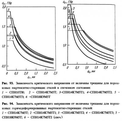 Определение вязкости разрушения и предела текучести порошковых мартенситно-стареющих сталей позволяет оценить их конструктивную прочность при статических нагрузках, используя следующее уравнение: где о — напряжение, действующее перпендикулярно к поверхности трещины; aс — критический размер дефекта; эллиптический интеграл второго рода; а и с — малая и большая оси эллипсообразной трещины. На рис. 93 приведены зависимости критического разрушающего […]