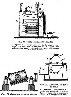 Для удаления жидкости из смеси после мокрого размола смесь сушат в специальных аппаратах, называемых дистилляторами. При небольших количествах смеси ее сушат в сушильных шкафах. Смесь нагревают до температуры 90—120° С, испаряющиеся из нее пары спирта отводят из сушильной камеры в холодильник, где они конденсируются. Сконденсированный спирт снова используют в производстве. Улавливание паров спирта составляет до […]