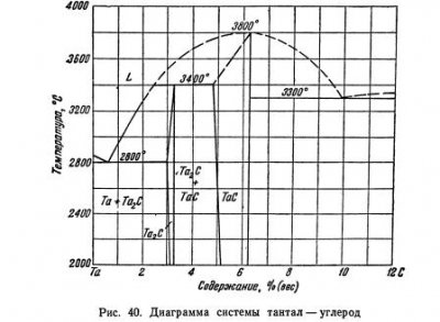 Диаграмма состояния системы тантал — углерод построена на основе рентгеноструктурного и металлографического исследования, а также определения температур плавления образцов, полученных вакуумным спеканием, плавлением или поверхностным науглероживанием тантала. Танталовый угол диаграммы показан на рис. 40. Налицо два соединения: Ta2C (3,21% С, температура плавления около 3400°) и TaC (6,23% С, температура плавления около 3800°). При 0,6% С […]