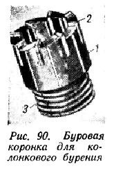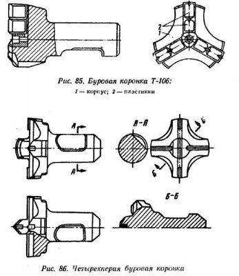 Для проходки шпуров и скважин ударным способом применяют буровые коронки ударного действия, армированные пластинками твердого сплава. Удары коронка получает от поршня перфоратора через составной бур. Бур состоит из нескольких штанг, соединенных между собой соединительными муфтами, удары поршня получает хвостовик, который и передает энергию удара коронке. Буровая коронка для перфораторов (рис. 82) состоит из корпуса 1, […]