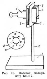 Для полевого колориметрического анализа широкое распространение получил полевой колориметр типа КПЛ-2 (рис. 91). Он предназначен для определения в воде компонентов pH, Fe», Fe»’, NH4, NO2′, NO3′, SiO2, H2S и свободного кислорода. Прибор состоит из корпуса 3 со зрительной трубой 7, компаратором 4 и вырезом 6. Корпус установлен на стойке 2. Стойка крепится к основанию 1. […]