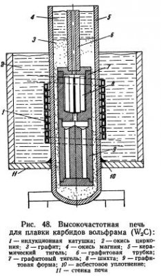 Плавление. Классическим методом получения карбида вольфрама является плавление в дуговой или трубчатой угольной печи сопротивления. При плавке вольфрама в электрической дуговой печи, так же как и восстановлением ангидрида вольфрама углеродом или карбидом кальция, Муассан получал сплавы вольфрама с 3,05—3,22% С, которые он считал соединением W2C (теоретически содержание углерода 3,16%). Ряд других исследователей получал образцы для […]