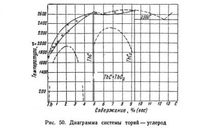 Получение Впервые сообщают о получении карбида ThC2 в дуговой электрической печи из окиси тория и углерода Труст, а также Муассан и Этард. Для исследования системы торий — углерод карбиды ThC и ThC2 готовили прессованием и спеканием смесей тория с графитом и получали при реакции расплавленного тория с графитом. Система торий-углерод Система торий — углерод исследована […]