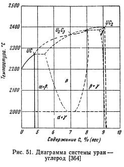 Получение Восстановление окиси урана U3O8 углеродом в дуговой электрической печи приводит при определенном соотношении окисла и углерода к образованию карбида U2C3. Позднее был получен литой карбид UC2. Наличие такого карбида подтвердили Гейслер, подвергавший UO2 карбидизации твердым углеродом при различных температурах и давлениях, и Хэгг — рентгенографически. В урановой стали существуют карбиды U2C3 (UC + UC2?) […]