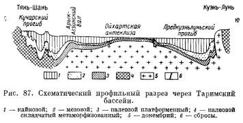 Таримский бассейн занимает наиболее крупную межгорную область Китая (площадью около 500 тыс. км2), заключенную между высокогорными герцинскими складчатыми сооружениями Тянь-Шаня и Куэнь-Луня (рис. 86). На отдельных участках южное и восточное обрамления бассейна образованы древними структурными элементами, консолидированными еще в докембрии и впоследствии или вовлеченными в энергичное поднятие вместе с палеозойской складчатой областью (Текеликтаг, Алтынтаг), или […]