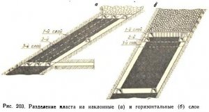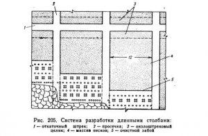 Среди систем разработки россыпей выделяют сплошные и столбовые; первые из них применяют в основном для разработки мерзлых россыпей, вторые — для талых. Сплошные системы разработки. На рис. 204 предоставлена получившая наибольшее распространение сплошная система разработки с отступающей лавой: из наклонного ствола 1 пройдены откаточный штрек 2 и рассечки 3, в конце которых проходят вентиляционные шурфы […]
