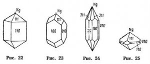 Циркон — ZrSiO4, с 67% ZrO2. Зачастую наблюдается примесь редких земель и тория, из которых количество тория доходит до 5%. Иногда содержит небольшое количество урана; гафний обнаружен в цирконе в виде примеси лишь недавно. Сингония тетрагональная. Обычно короткостолбчатый (рис. 22 и 23), изредка длинно-призматический с пирамидальными ограничениями с обоих концов (рис. 24; бывают формы раза […]