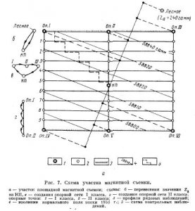 При высокоточной магнитной съемке (общей точностью 5—10 гамм) предварительно создают опорную сеть I и II классов. Для съемки средней (15—20 гамм) и низкой точности опорная сеть I класса обычно не нужна. Общая схема участка высокоточной магнитной съемки показана на рис. 7. Опорную сеть I класса создают путем многократных наблюдений на опорных точках, образующих замкнутый полигон […]