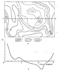 Результаты профильных магниторазведочных работ изображают в виде графиков Zа (рис. 9,б). По горизонтальной оси откладывают точки наблюдений в масштабе построения геологического разреза. Вертикальный масштаб графиков выбирают таким образом, чтобы в 1 мм укладывалось значение точности съемки. По результатам площадной съемки строят планы графиков и планы изодинам Zа (см. рис. 9, а). При построении планов графиков […]