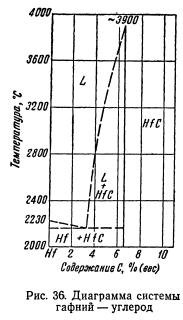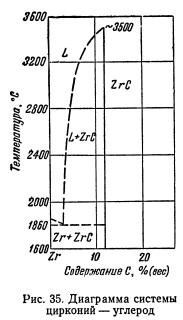 На рис. 35 показана часть гипотетической диаграммы состояния системы цирконий — углерод по Гольдшмидту лишь с одним карбидом ZrC. Другой якобы существующий карбид ZrC2 на самом деле представляет собой смесь из ZrC и графита. При температурах выше 2430° углерод растворяется в карбиде циркония так, что температура плавления снижается от 3030° до указанной температуры. Точное положение […]
