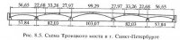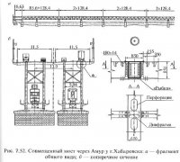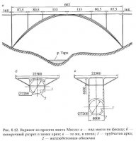 Технологические и иные достоинства арки с балкой жесткости обусловили применение этой системы в мостах не только под автомобильную, но и железную дорогу. Она использована в цельносварном пролетном строении пролетом 66 м, разработанном институтом электросварки имени академика Е.О. Патона (рис. 9.11, а). Особенностью конструкции является включение в совместную работу с затяжками продольных балок, имеющих одинаковую с […]