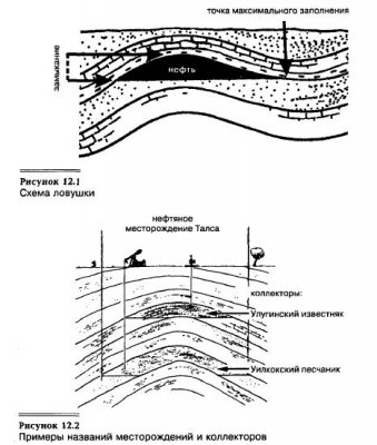 Первоначально нефтяные ловушки были заполнены водой, впоследствии вытесненной проникшими туда газом и нефтью. Так как и нефть и газ легче воды, ловушка заполняется сверху вниз. В принципе, она может быть заполнена до определенного уровня (вниз), который характеризуется точкой максимального заполнения ловушки (см. рис. 12.1). Эта точка располагается на краю антиклинали или купола. Расстояние по вертикали […]
