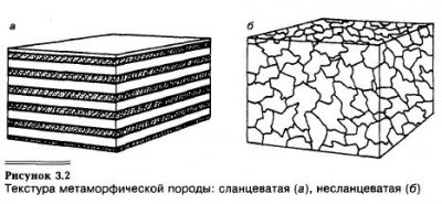 Горные породы классифицируются и определяются по их текстуре и минеральному составу. Понятие текстуры для магматических пород основано на размерах кристаллов минералов, которые варьируют от видимых невооруженным глазом до стекловидных минералов с неразличимыми кристаллами. Текстура метаморфических пород характеризуется размером и пространственной ориентацией кристаллов. Сланцеватая метаморфическая порода состоит из параллельных крупносланцеватых кристаллов (см. рис. 3.2а). Несланцеватые метаморфические […]