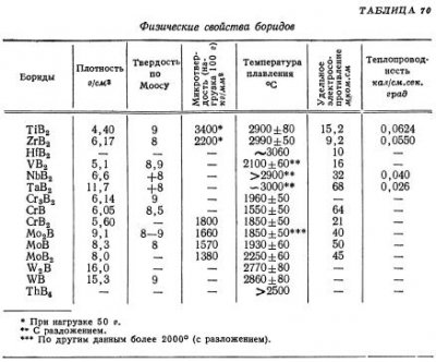 В табл. 69 приведены структуры и периоды решеток всех известных боридов металлов IV, V и VI групп периодической системы элементов. Табл. 70 содержит результаты определений плотности, твердости, температуры плавления, удельного электрического сопротивления и теплопроводности отдельных боридов. Некоторые дополнительные сведения даны в работе. Систематические данные о структуре, термической и химической устойчивости боридов представлены в новой работе […]