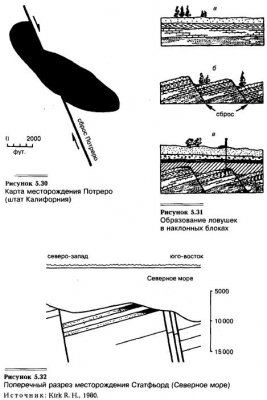 Трещины Трещина — это разлом горных пород, происходящий без смещения одной части относительно другой (см. рис. 5.15). Трещины в осадочных породах улучшают их свойства как пород-коллекторов. Они повышают пористость (объем запасаемых флюидов) и проницаемость (способность флюидов проникать сквозь породу). Любая порода, имеющая трещины природного происхождения, может стать породой-коллектором. Сбросы Сбросы — это разломы в породах, […]