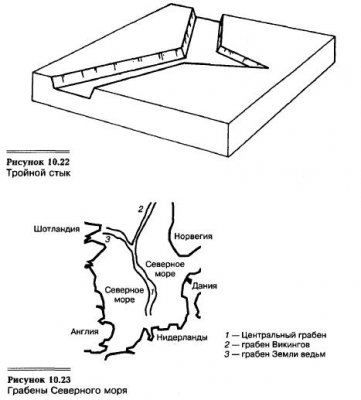 Первоначальный разлом континента, согласно теории тектоники литосферных плит, может иметь вид тройного стыка, который представляет собой точку в центре, где сходятся три рифта (рукава) (см. рис. 10.22). Обычно два рукава объединяются, продолжая углубляться, что приводит к образованию океана. Третий рукав прекращает спрединг и называется авлакогеном (глубокой узкой впадиной). Авлакоген — это грабен, который иногда бывает […]