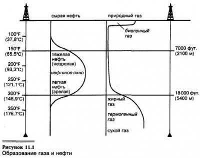 Наиболее важным фактором в образовании сырой нефти из органического вещества осадочных пород является высокая температура. Минимальная температура, необходимая для формирования нефти в стандартных условиях осадочного бассейна (см. рис. 11.1), составляет примерно 150°F (65°С). Такая температура достигается при погребении богатых органическим веществом материнских пород. Чем больше глубина, тем выше температура. На относительно небольших глубинах температура недостаточна […]