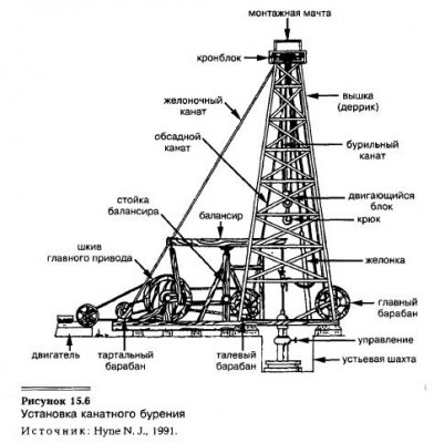 Когда в Тайтусвилле (Пенсильвания) в 1859 г. была пробурена первая промышленная скважина, для этого использовалась установка канатного бурения. Такие установки применяли в течение сотен лет для добычи пресной воды или рассолов, которые затем выпаривали для получения соли. Установка (станок) канатного бурения — устройство относительно простое (см. рис. 15.6). Она состоит из вышки на четырех опорах, […]