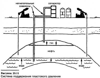 В процессе добычи давление в коллекторе снижается и вода обычно просачивается сбоку и снизу, замещая ранее находившиеся там флюиды. Если же такого замещения не происходит, то порода-коллектор постепенно уплотняется, и поверхность земли над ней может осесть (см. рис. 25.12). Такая ситуация возникла на нефтяном месторождении Уилмингтон (Лонг-Бич, Калифорния), где добыча производится с 1930-х годов. К […]