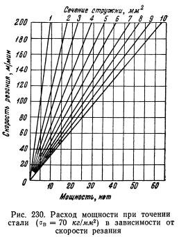 Так как твердые сплавы допускают значительно более высокие скорости резания и большие поперечные сечения стружки, то они требуют более мощных станков. В табл. 155 приведены скорости резания и потребные мощности при обработке стали разной прочности твердым сплавом и быстрорежущей сталью. При обработке материалов повышенной прочности нарастание скорости резания опережает повышение мощности. Данные о возможных скоростях […]