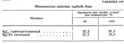 Рышкевич описал электротермическое получение карбида бора B4C и привел следующие значения прочности при изгибе горячепрессованных образцов: 35,2 кг/мм2 при комнатной температуре; 29,5 кг/мм2 при 650° и 24,6 кг/мм2 при 1100°. По данным автора, модуль упругости при комнатной температуре равен 29 600 кг/мм2. Кратковременная прочность карбида бора при 980° равна 15,8 кг/мм2, при 1425°— 16,5 кг/мм2 […]